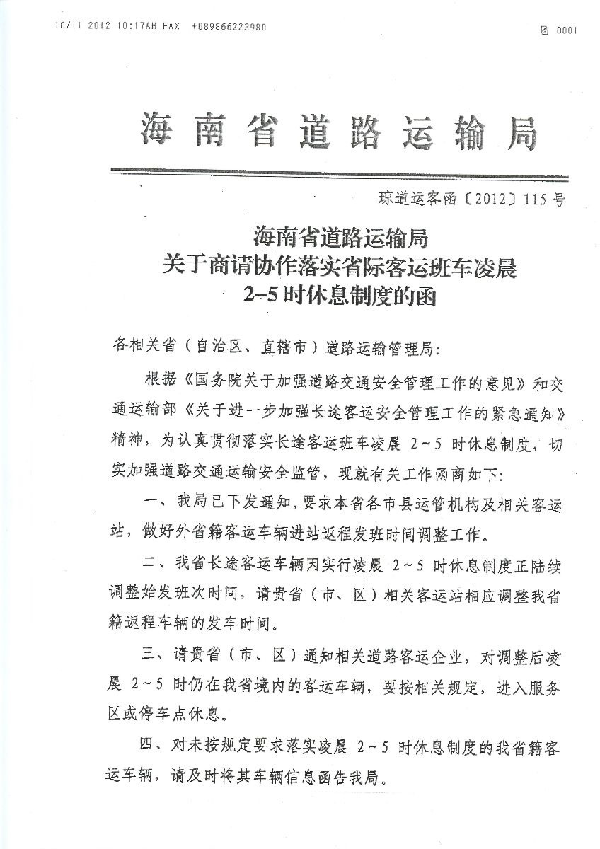 转发海南运管局关于商请协作落实省际客运班车凌晨2-5时休息制度的函
