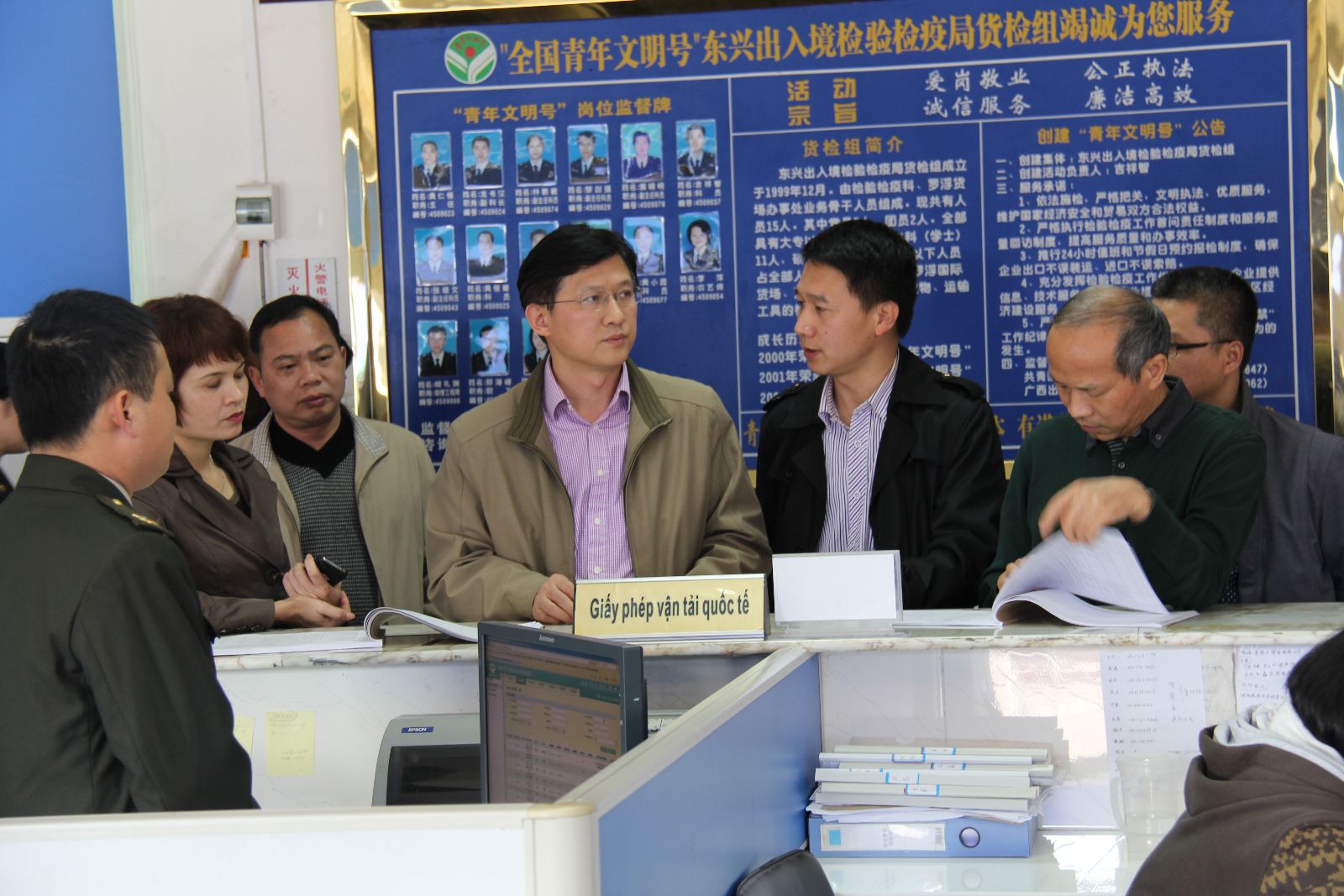 图为:黄汝生副厅长视察东兴口岸国际道路运输管理处工作情况